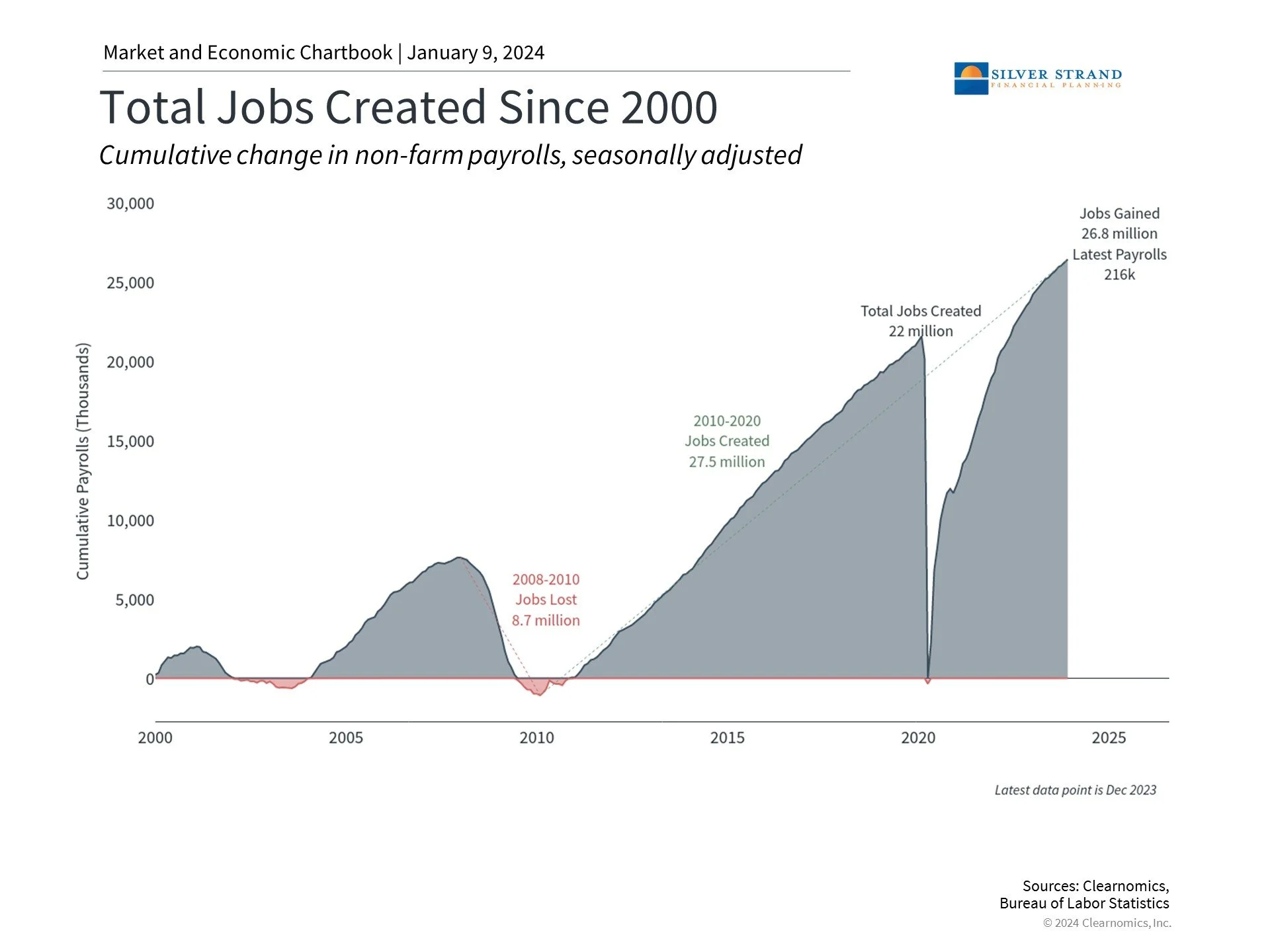 Last week's jobs data also showed that the labor market has slowed but remains historically strong. Unemployment was steady at only 3.7% and 216,000 new jobs were added in December, although there were also 71,000 in downward revisions to the prior two months. Still, this means that 2.7 million new jobs were created in 2023, an exceptional pace that adds to the cumulative job gains shown in the accompanying chart.